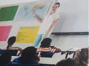 DescriptionIn a classroom scene, a teacher stands before a whiteboard, gesturing towards a world map. The teacher, dressed in white shirt and light blue trousers, is actively engaging with the students. The students, seated at their desks and facing the teacher, appear attentive to the lesson. The walls are adorned with various colorful posters, including a prominent bright yellow one with text that seems to be part of the instructional materials.