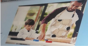 DescriptionIn the picture, there’s a dad and his little boy cooking in the kitchen. The father, wearing a patterned apron, is showing his son, who’s dressed as a chef, how to work with dough and cookie cutters on the counter-top. The father trains his son while how to make bread on countertop